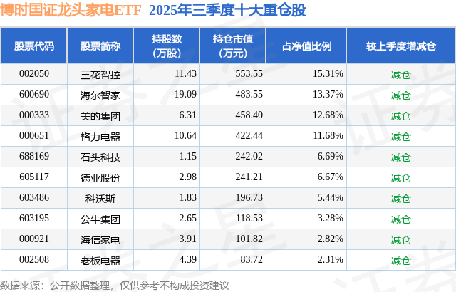 从基金规模来看,博时国证龙头家电ETF基金2025年三季度公布的基金规模为0.36亿元,较上一期规模3718.33万元变化了-101.73万元,环比变化了-2.74%。该基金最新一期财富设立为:股票占净值比98.54%,无债券类财富,现款占净值比1.5%。从基金握仓来看,该基金当季前十大股票仓位达80.25%,第一大重仓股为三花智控(002050),握仓占比为15.31%。